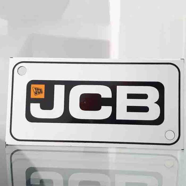 Shiny chrome-finish aluminum branding labels and plates.